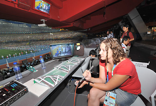 A reporter with BBC live broadcasts atthe closing ceremony of the Beijing Paralympic Games in the National Stadium, better known as the "Bird's Nest", in Beijing on September 17, 2008. [Xinhua]