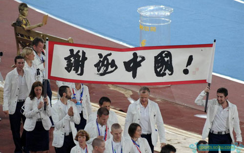 Team Britain holds up a banner that reads in Chinese: "Thank You, China" as they walk into the Bird's Nest before the closing ceremony of the Beijing Paralympic Games September 17, 2008.[sohu.com]