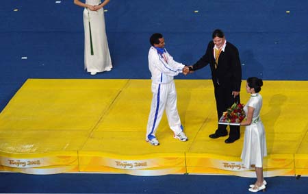 South African swimmer Natalie du Toit (R) shakes hands with Panamanian runner Said Gomez on the podium before they receive the Whang Youn Dai Achievement Award at the closing ceremony of the Beijing 2008 Paralympic Games in the National Stadium on Wednesday night. [Xinhua]
