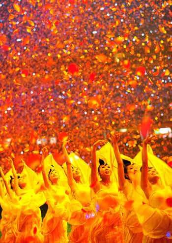 Performers dance while red leaves are shaked off at the center of the field during the closing ceremony of Beijing 2008 Paralympic Games at the National Stadium, September 17, 2008.[Xinhua]