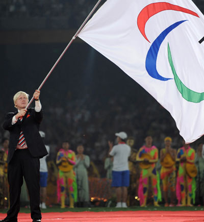 London Mayor Boris Johnson waves the Paralympic flag at the Games' closing ceremony in the Beijing National Stadium on Wednesday night. [Xinhua]