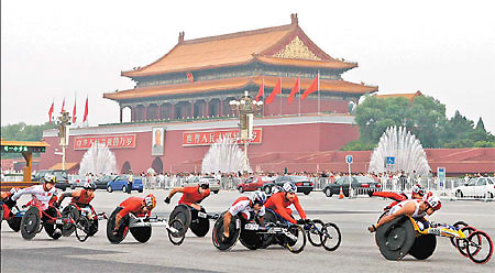 Marathon record: Paralympic marathon racers in the T52 classification pass by Tian'anmen Square September 17, 2008. Australia's Thomas Geierspichler set a new world record for the class with a time of 1:40:07. [Xinhua]