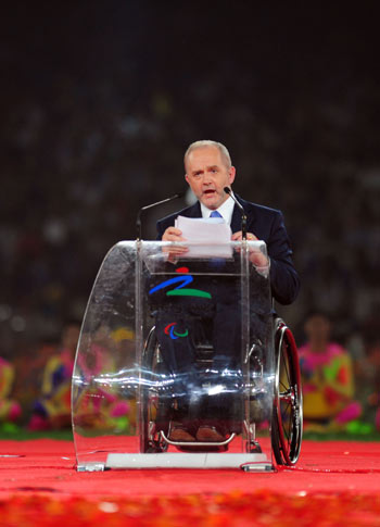 International Paralympic Committee (IPC) president Philip Craven delievers a speech in the Nationa Stadium at the closing ceremony of the Beijing Paralympic Games, September 17, 2008. [Xinhua]