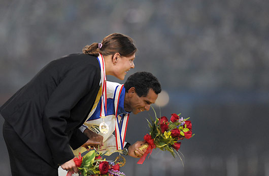 South African amputee swimmer Natalie du Toit and visually-impaired Panamanian runner Said Gomez take a bow to the spectators. Both of them received the Whang Youn Dai Achievement Award, a special award for athletes who can best represent the Paralympic spirit, at the closing ceremony of the Beijing 2008 Paralympic Games in the National Stadium September 17, 2008. [Xinhua]