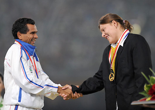 South African amputee swimmer Natalie du Toit and visually-impaired Panamanian runner Said Gomez greet each other after receiving the Whang Youn Dai Achievement Award, a special award for athletes who can best represent the Paralympic spirit, at the closing ceremony of the Beijing 2008 Paralympic Games in the National Stadium September 17, 2008. [Xinhua]