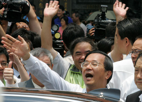 Taiwan 'President' Chen Shui-bian (front) waves to supporters after a prayer