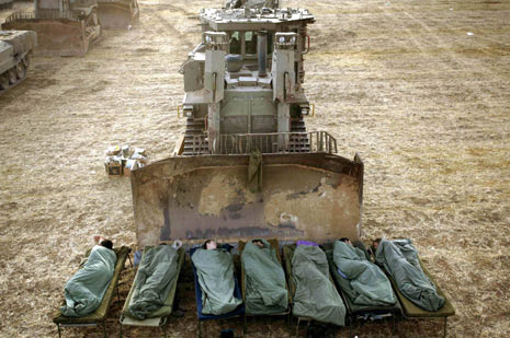 Israeli soldiers sleep in a military staging area near Kibbutz Mefalsim, just outside the northern Gaza Strip, June 27, 2006.