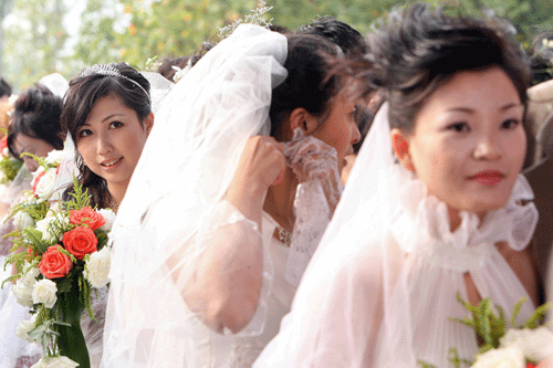 Some of 70 couples stand in a queue during a mass wedding event in Shanghai October 5, 2006. Some 2,000 couples registered their marriage this Monday in Shanghai, according to statistics, and there is an estimated 30,000 couples to hold their weddings during the seven-day holiday period or the 'Golden Week' holiday, the Xinhua news agency said. [Reuters]