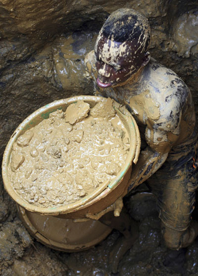 A Congolese man lifts a bucket filled with mud as he