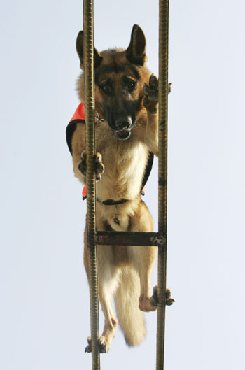 A rescue dog undergoes training inside a fire-fighting base in Beijing November 1, 2006. Beijing's first rescue dog squad, which will be used for disaster relief, are being trained for the 2008 Olympics, local media reported. [Reuters]