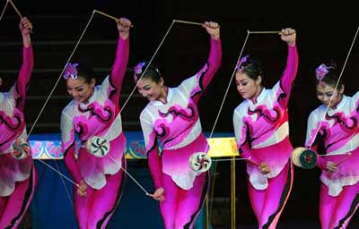Chinese girls play diabolo during the performing gala