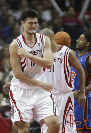 Houston Rockets center Yao Ming reacts after a play in second period action against the New York Knicks during their NBA game in Houston November 10, 2006. [Reuters]