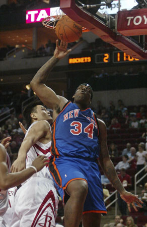 New York Knicks center Eddy Curry (34) dunks the ball over Houston Rockets center Yao Ming during the first period of their NBA game in Houston November 10, 2006. [Reuters]