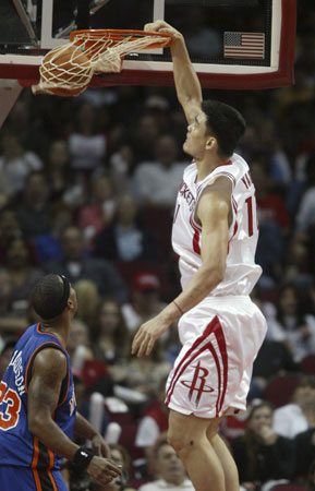 Houston Rockets center Yao Ming dunks over New York Knicks' Quentin Richardson during the first period of their NBA game in Houston November 10, 2006. [Reuters]