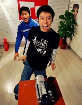 Huang Yixin, front, and Wei Wei, back, former college roommates from south China who last year found worldwide web notoriety with their low-quality, high-hilarity lipsynching clips, perform one of their famous numbers during a recording session in Beijing, China Dec. 12, 2006. Their mock music videos draw millions of Internet viewers and thousands of fawning reviews by fans who declare them hilarious, talented, cute, and hot. They posted their first 'performance,' a 4.5 minute clip of lipsynching to the Backstreet Boys hit 'I Want It That Way,' to their college intranet in March 2005. It quickly migrated to big sites like YouTube and Google Video and fast became one of the most watched and highest rated amateur clips online. [AP] |