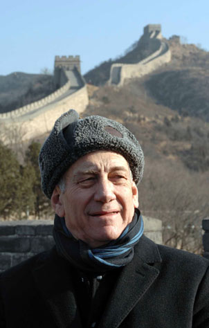 Israel's Prime Minister Ehud Olmert visits the Great Wall of China in Badaling, on the outskirts of Beijing January 10, 2007 in this picture released by the Israeli Government Press Office (GPO). Olmert arrived in Beijing on Tuesday for three-day visit focusing mainly on Iran's nuclear programme and bilateral trade.  [Reuters]