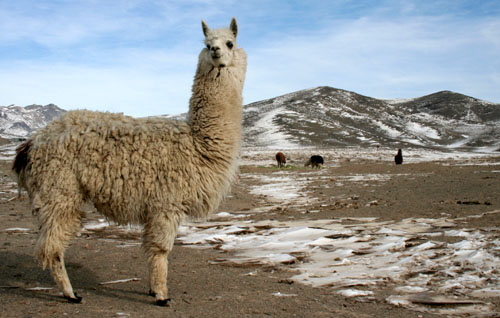 An alpaca is seen at the wild animal conservation in Tianshan Mountain area in Xinjiang Uygur Autonomous Region January 10, 2007. Staff members in the conservation zone were providing a safe environment as wild animals lived through severe winter. [Xinhua]