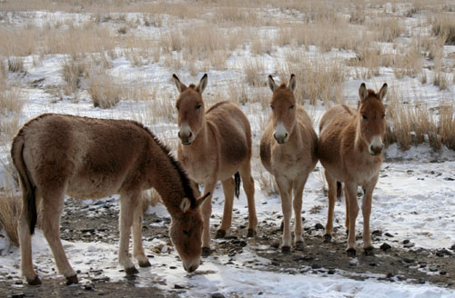 Donkeys are seen at the wild animal conservation in Tianshan Mountain area in Xinjiang Uygur Autonomous Region January 10, 2007. Staff members in the conservation zone were providing a safe environment as wild animals lived through severe winter. [Xinhua]