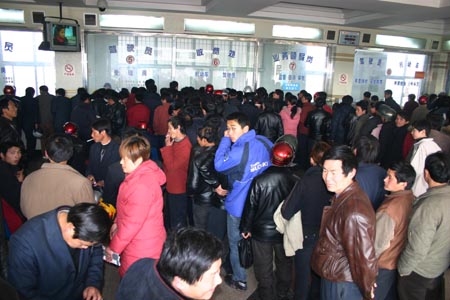 More than 600 motorists flock at the vehicles administration office waiting to get their motorcycles registered in Lujiang county, east China's Anhui Province March 13, 2007. The crack-down on unlicenced vehicles by local police has reduced traffic accidents during the Spring Festiva. [newsphoto]