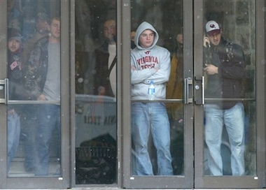 the doorway of McBryde Hall on the Virginia Tech campus in Blacksburg, Va., as