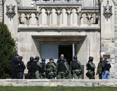 Police SWAT teams assemble outside Norris Hall on the Virginia Tech campus in Blacksburg, Va., Monday, April 16, 2007. [AP]