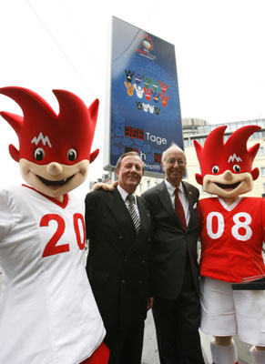 Swiss soccer association President Ralf Zloczower (R) and Basel euro 2008 delegate Hanspeter Weisshaupt pose for photographers beside Euro 2008 official mascots Trix and Flix during the euro 2008 countdown clock unveiling ceremony in Basel June 7, 2007. [Reuters]