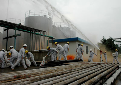 Rescuers clear up leaked crude oil during an emergency drill in Huai'an, East China's Jiangsu Province June 27, 2007. Ten departments, including firefighting agencies, environmental protection bureaus, took part in the drill featuring firefighting, personnel rescue and water pollution prevention. [Xinhua]