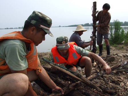 reinforce dikes in the flooded area in Chuzhou, East China's Anhui
