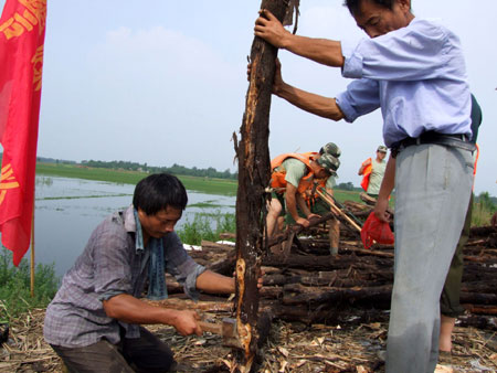 Soldiers and local residents reinforce dikes in the flooded area in Chuzhou, East China's Anhui Province, July 25, 2007. As more rain has been forecast, the flood-battered banks of the Huaihe River face an increased risk of breaches after weeks of pressure from high water levels. [Newsphoto]