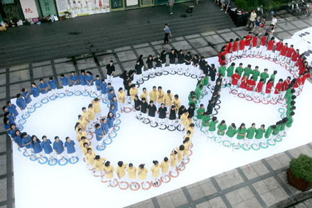 Department store employees stand wearing coloured shirts to form the Olympic rings at the store entrance to celebrate the upcoming one-year countdown to the 29th Beijing Olympic Games, in Hangzhou, East China's Zhejiang Province, August 6, 2007. [newsphoto]