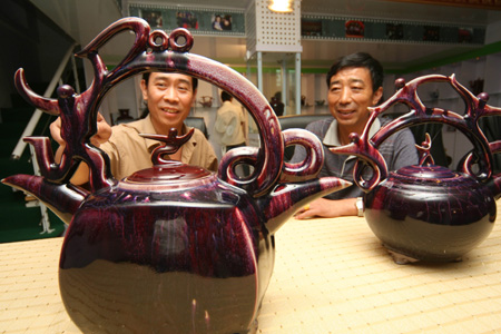 Visitors watch teapots featuring sports designs in Yuzhou, Central China's Henan Province, August 7, 2007. Artisan He Wenqi designed and produced the set of wares to commemorate the upcoming Beijing Olympic Games next year. [newsphoto]