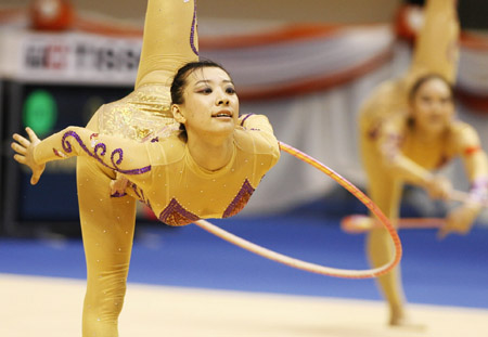 Updated: 2007-08-18 11:57 ![]() Chinese gymnasts compete during the rhythmic gymnastics group finals at the ongoing Universiade held in Bangkok, Thailand, August 17, 2007. [Xinhua]