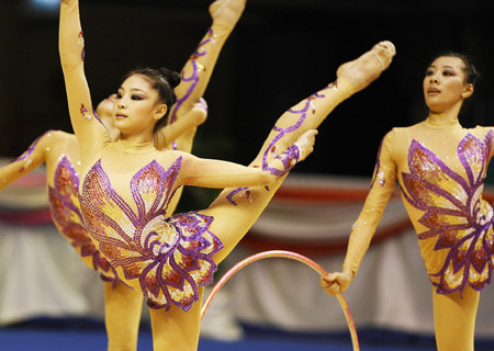 Chinese gymnasts compete during the rhythmic gymnastics group finals at the ongoing Universiade held in Bangkok, Thailand, August 17, 2007. [Xinhua]