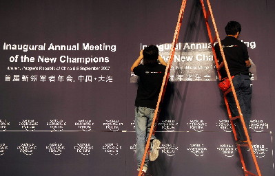 Workers prepare for the meetings in the Plenary Hall in the Dalian World Expo Center in Dalian, a coastal city in Northeast China's Liaoning Province, September 4, 2007. The Inaugural Annual Meeting of the New Champions organized by the World Economic Forum is going to be held here on September 6-8. [Xinhua]