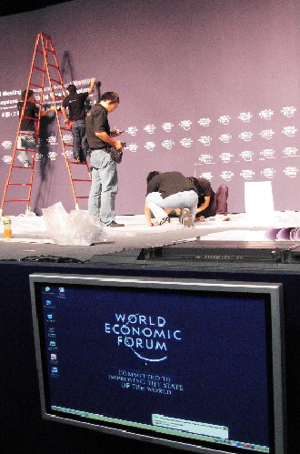 | Workers prepare for the meetings in the Plenary Hall in the Dalian World Expo Center in Dalian, a coastal city in Northeast China's Liaoning Province, September 4, 2007. The Inaugural Annual Meeting of the New Champions organized by the World Economic Forum is going to be held here on September 6-8. [Xinhua] |