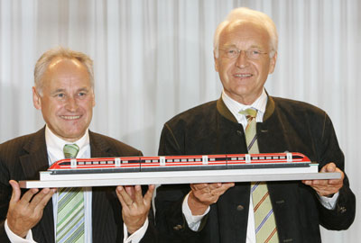 Edmund Stoiber (R), outgoing Bavarian state premier and leader of Bavaria's conservative Christian Social Union (CSU), and Bavarian Economy Minister Erwin Huber hold a model of a Transrapid high-speed train in Munich September 25, 2007. The German state of Bavaria said on Tuesday it had signed an agreement with rail operator Deutsche Bahn and an industrial consortium to build a Transrapid high-speed railway line from Munich city centre to its airport. [Reuters]