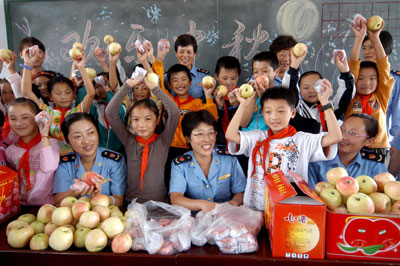 Updated: 2007-09-25 22:29 ![]() Left behind children hold up apples given by their surrogate mothers - law enforcement officers - during a gathering to celebrate the traditional Mid-Autumn Festival in Lianyungang, East China's Jiangsu Province September 25, 2007. These children's real parents have rushed to thriving cities and regions across the country to eke out a living. [newsphoto]