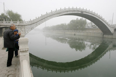 Residents chat near a bridge as thick smog envelops Beijing October 26, 2007. [Agencies]