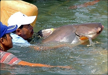 Cambodia men release a Mekong giant catfish in the Phnom Penh river in 2005. The planned hydropower dams on the Mekong in Laos, Thailand and Cambodia could displace tens of thousands of people and endanger up to 1,300 aquatic species including the rare Mekong giant catfish and the Irrawaddy dolphin, activists said. [Agencies]
