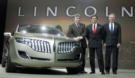 Ford Motor Company executives Peter Horbury (L), Mark Fields and Derrick Kuzak (R) pose with the Lincoln MKT concept vehicle during the media preview at the 2008 North American International Auto Show in Detroit January 14, 2008. [Agencies]