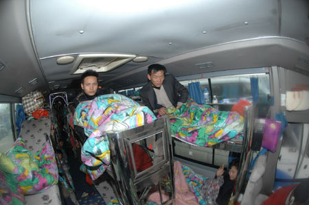 Passengers rest in a stranded coach at the Hunan section of Jing-Zhu Expressway (Beijing-Zhuhai) January 27, 2008. More than 20,000 coaches and over 60,000 passengers were affected by the freezing weather which paralyzed the trans-provincial highways. [Xinhua]