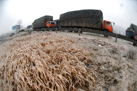Trucks line up at the Hunan section of Jing-Zhu Expressway (Beijing-Zhuhai) January 27, 2008. More than 20,000 coaches and over 60,000 passengers were affected by the freezing weather which paralyzed the trans-provincial highways. [Xinhua]