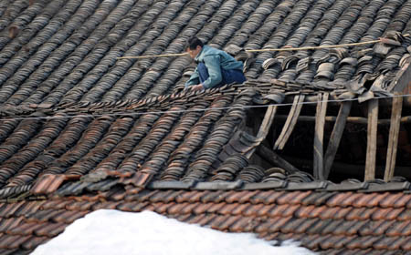 Villager Wang Mincang repairs the roof of his house, which was damaged during the severe snow disaster in January, in Tianbu Village, Shucheng County, East China's Anhui Province, Feb. 17, 2008. Shucheng is recovering with a full-scale reconstruction after suffering severe damage during this year's snow disaster. [Xinhua]