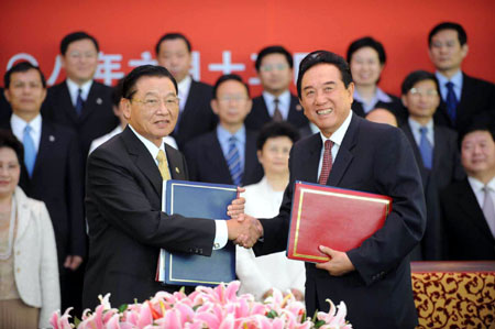 Chen Yunlin (R), chairman of the mainland's Association for Relations Across the Taiwan Straits (ARATS), and Chiang Pin-kun, chairman of the Taiwan-based Straits Exchange Foundation (SEF), shake hands after signing the agreements on cross-Straits weekend charted flights and mainland tourists' traveling to Taiwan, in Beijing, China, June 13, 2008. [Xinhua]