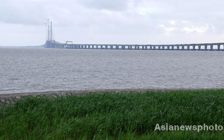 A view of the Shanghai Yangtze Bridge under construction over the mouth of the Yangtze River in Shanghai, East China, June 27, 2008. Shanghai is working on a mass transport project, including a bridge and tunnel to connect suburban islands to the city center. [Asianewsphoto]