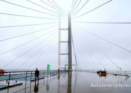 A view of the Shanghai Yangtze Bridge under construction over the mouth of the Yangtze River in Shanghai, East China, June 27, 2008. Shanghai is working on a mass transport project, including a bridge and tunnel to connect suburban islands to the city center. [Asianewsphoto]