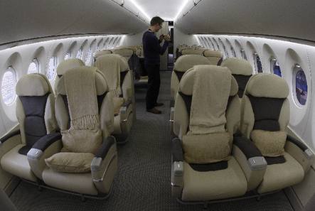 A visitor takes a photograph inside a mock up of the interior cabin of a Bombardier CSeries jet displayed at the 2008 Farnborough International Air Show, Hampshire, southern England July 13, 2008. [Agencies]