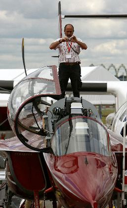 A worker takes a photograph of an Alenia Aermacchi M346 aircraft displayed at the 2008 Farnborough International Air Show, Hampshire, southern England July 13, 2008. [Agencies]