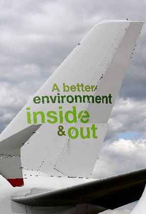 The tail fin of an Airbus A380 aircraft is displayed at the 2008 Farnborough International Air Show, Hampshire, southern England July 13, 2008. [Agencies]