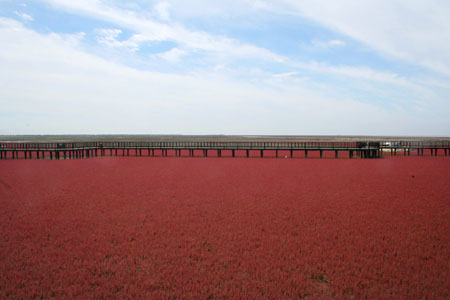 The Red Beach National Reserve in Panjin, northeastern China's Liaoning province recently opened to tourists, Xinhua News Agency reports. Tourists are attracted to the bright red seaweed at the reserve, which occupies an area of 20 square kilometers. Located on the wide, flat wetlands near the mouth of the Liaohe River, the Red Beach National Reserve in Panjin is famous for its bird and wildlife habitat. |